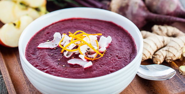 The ABC’s are a little different around the Vega kitchen. Combining apples, beets and coconut milk makes for a rich and hearty beet apple soup that’s perfect anytime.