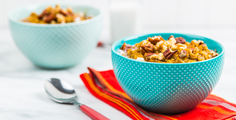 With a half cup of pumpkin per serving, this high-fiber, energy-packed breakfast bowl will easily tide...