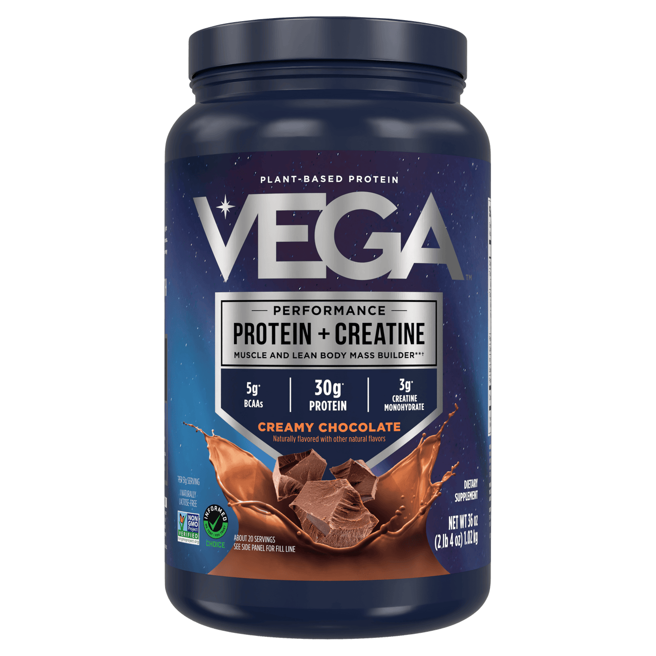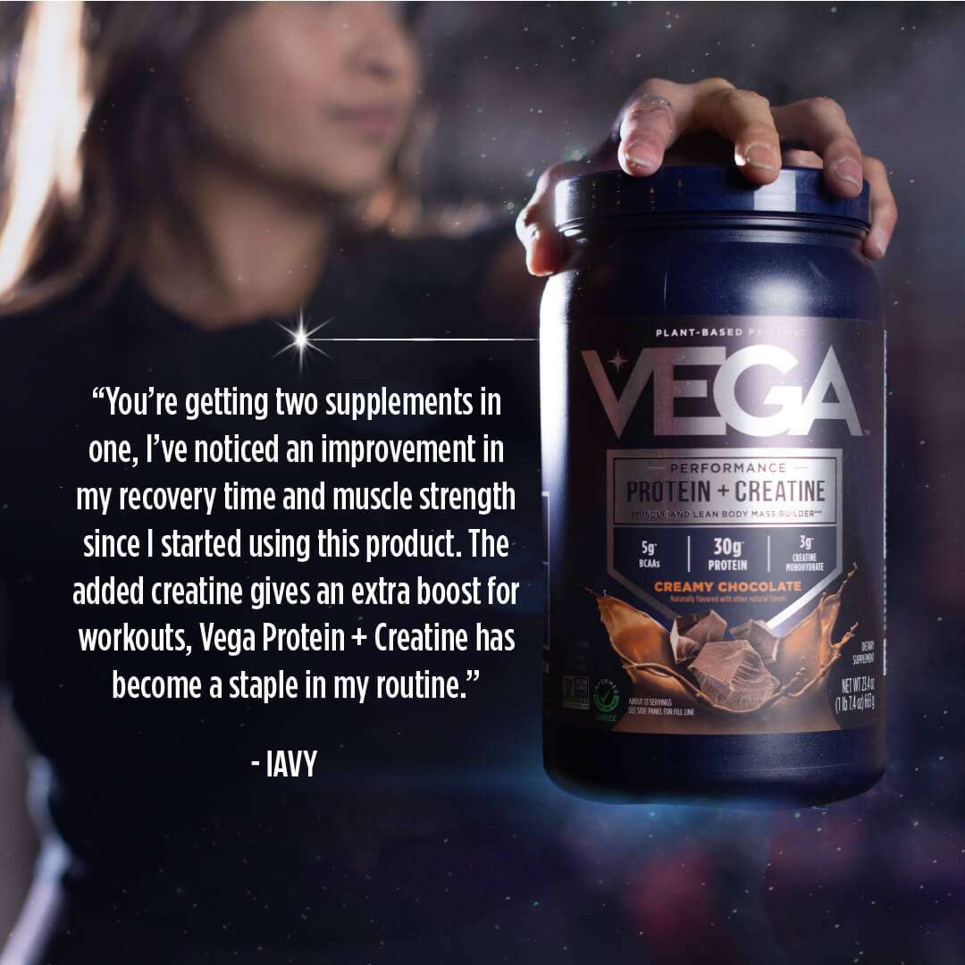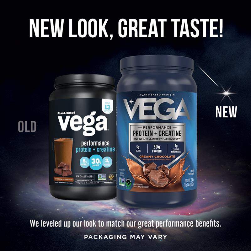 • Vega Performance Protein + Creatine creamy chocolate plant-based protein supplement with 30g protein and 3g creatine This Product