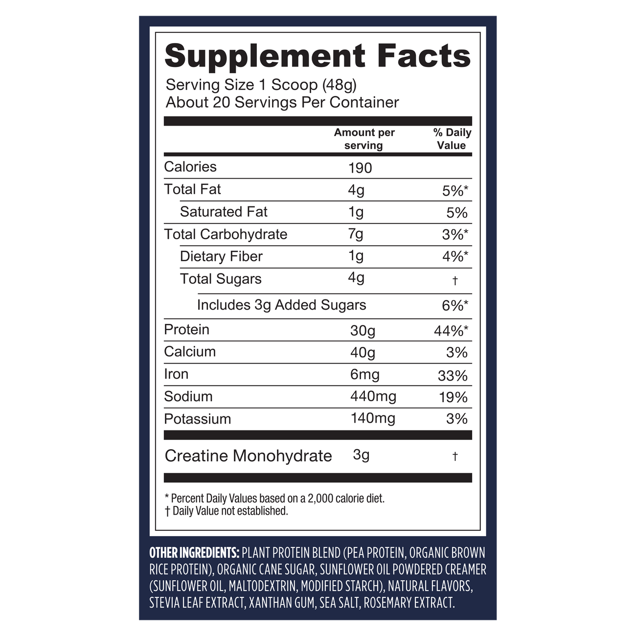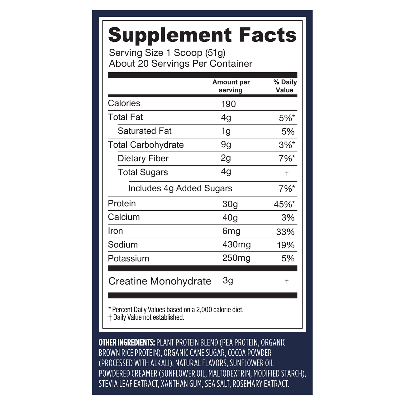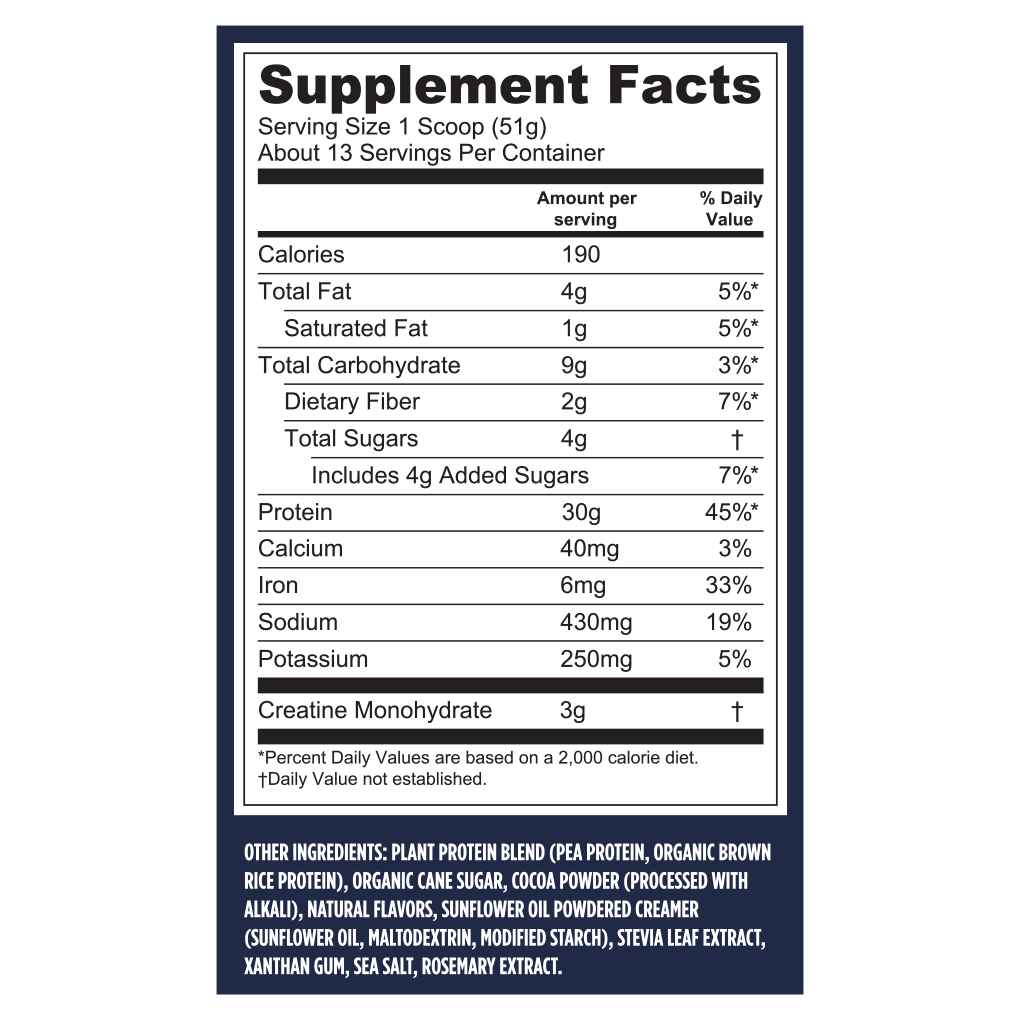 Other Ingredients (Chocolate): Plant Protein Blend (Pea Protein, Organic Brown Rice Protein), Organic Cane Sugar, Cocoa Powder (Processed With Alkali), Natural Flavors, Sunflower Oil Powdered Creamer (Sunflower Oil, Maltodextrin, Modified Starch), Stevia Leaf Extract, Xanthan Gum, Sea Salt, Rosemary Extract.